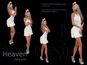 IE – Bento – Heaven Bento – Heaven – A set of 4 poses plus mirrors (8 poses in total) – $250L Available instore and via marketplace Leave a comment Cancel reply Δ