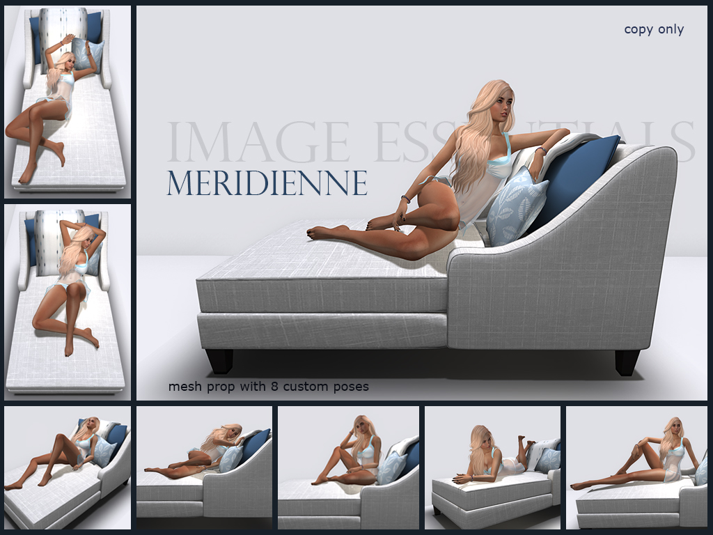 IE – Meridienne Meridienne – Mesh Prop with 8 custom poses – $300L Available instore and via marketplace Leave a comment Cancel reply Δ