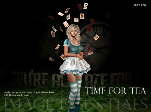 IE – Time for Tea Time for Tea – mesh card prop and attaching butchers knife with single pose – $100L Available instore and via marketplace Leave a comment Cancel reply Δ